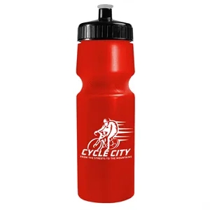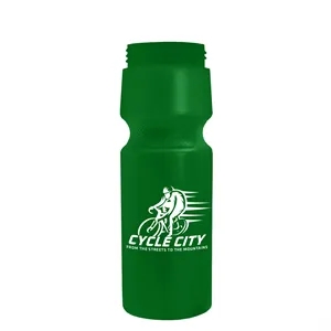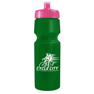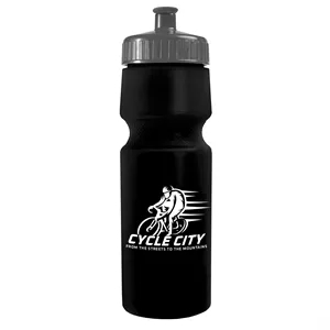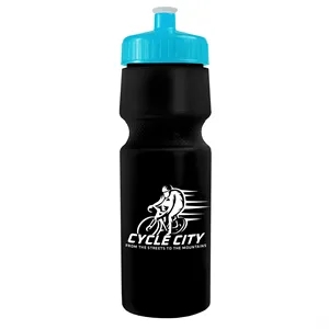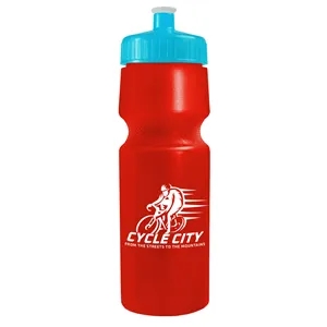 24 oz. Circular Bike Bottles with Push pull lid. Bottle includes second side stock imprint "Molded with 50% Molecular Recycled...