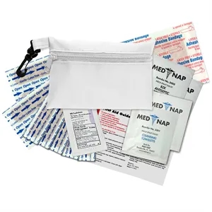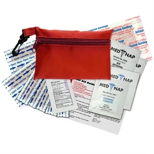 Brightly colored polyester first aid zip bag with hang clip. Convenient, compact, and excellent for trade show giveaways.