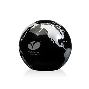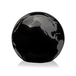 Wonderful 3" World Globe Paperweight in deep black optical crystal. Available with hand deep etch, gold or silver colorfill.