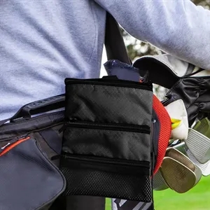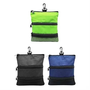 Multi-pocket golf pouch with carabiner clip. Holds tees, markers, gloves, or valuables. Great for tournaments, clubs, branding.