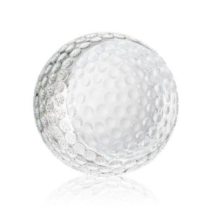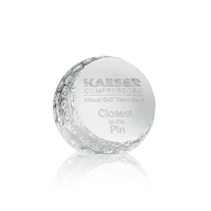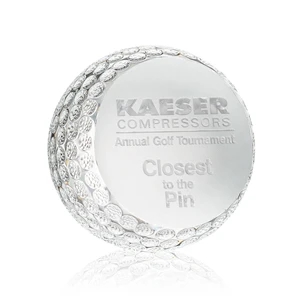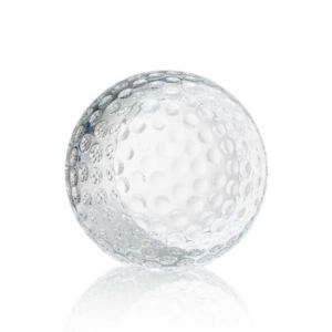Optically clear golf ball paperweight with golf ball divots for authenticity.