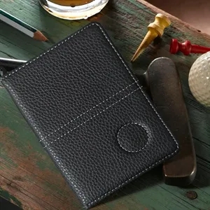PU leather golf scorecard holder with card slots and elastic band. Compact, professional, perfect for golf events & promotions.