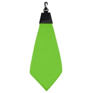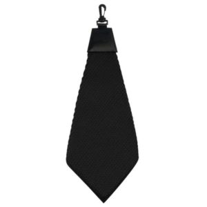 11.5" x 11.5" polyester golf towel with waffle design, triangle fold and plastic swivel hook.