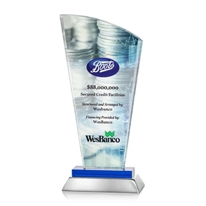 Unique curved optical award with blue optical and aluminum base.