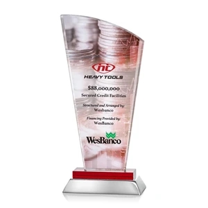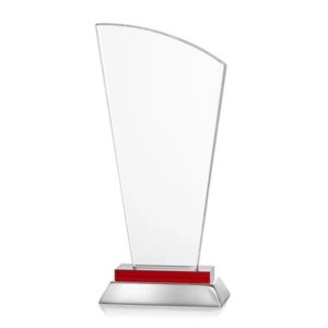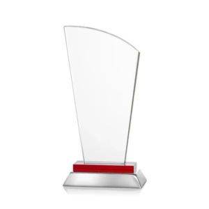 Unique curved optical award with red optical and aluminum base.