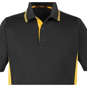 Men's polo with moisture-wicking and anti-microbial performance, collar, three-button placket, buttons, and side vents.