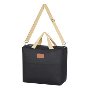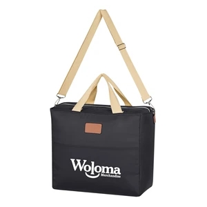 Cooler tote bag with laminated foam insulation, an adjustable and removable shoulder strap, and web carrying handles.
