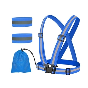 Three-piece safety set with reflective belt vest, a pair of armbands and a drawstring storage bag.