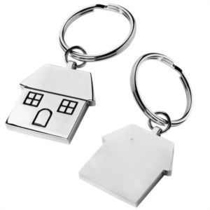 3" x 1.25" x 0.13" metal key tag with house shape.