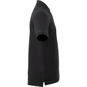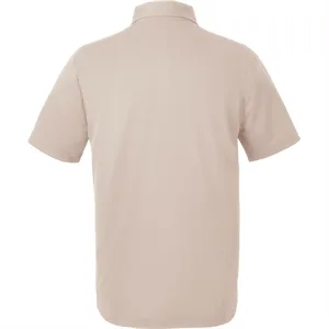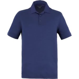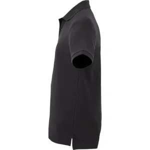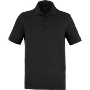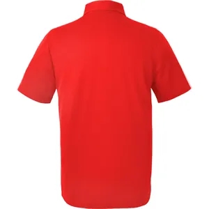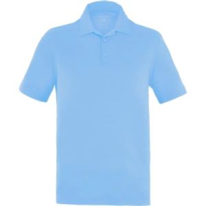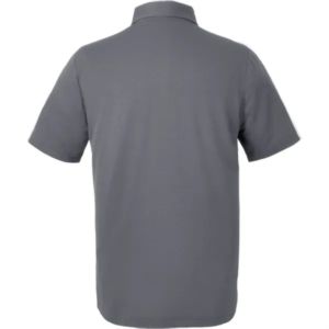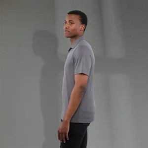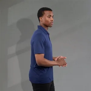 Men's performance polo shirt with three button placket and moisture-wicking capabilities.