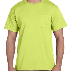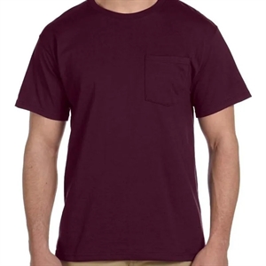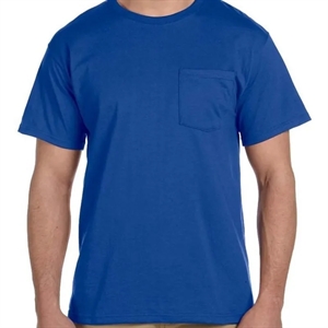 Pocket t-shirt with a 1x1 rib collar, double-needle cover-stitching, shoulder-to-shoulder tape, and left chest pocket.