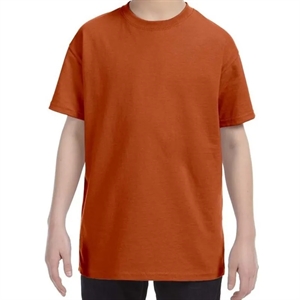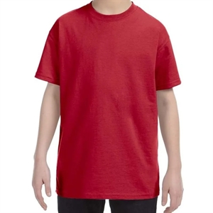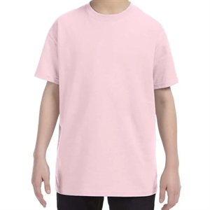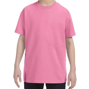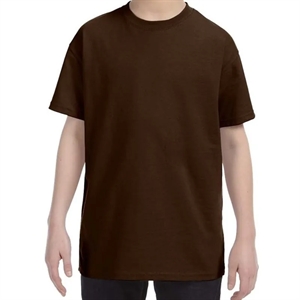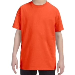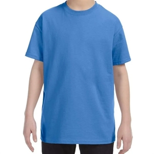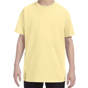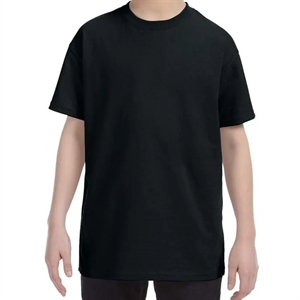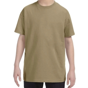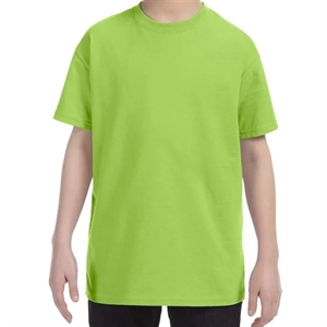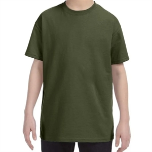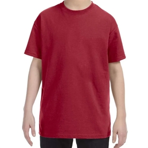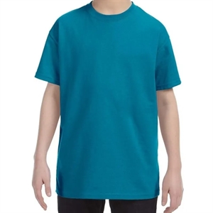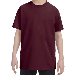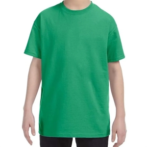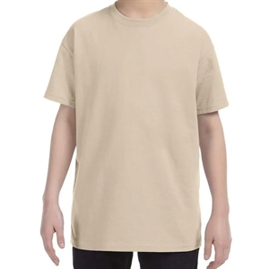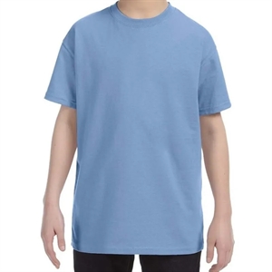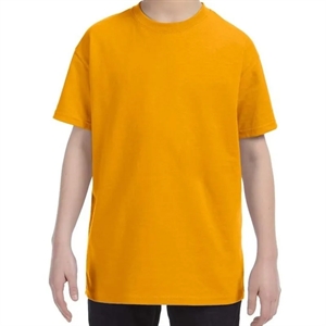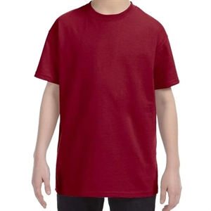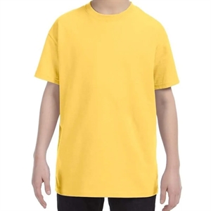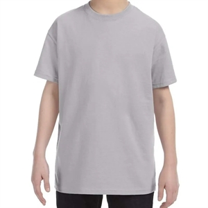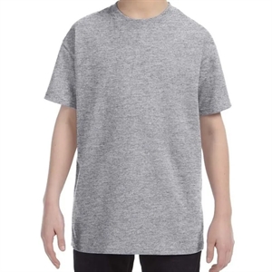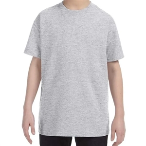 Youth t-shirt with rib-seamed collar, double-needle cover-stitched front neck, and shoulder tape.