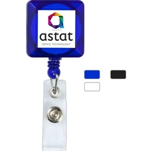 1 1/4" x 1 1/4" plastic square badge with metal clip on 30" retractable reel.
