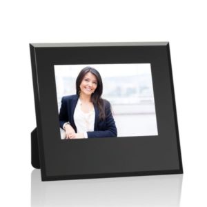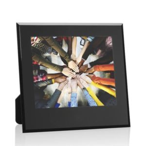 Striking Beveled Crystal Frame features a shimmering gold or silver foil backing that peaks through the laser engraved blacking