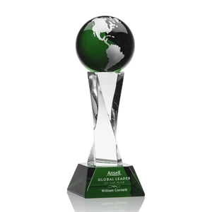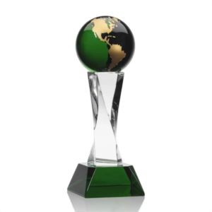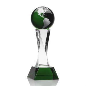 The Langford Globe Award features an elegant 4" Green Optical Crystal globe with continents deep etched with gold or silver.