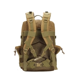 Oxford fabric military style tactical backpack with zipper and sliding buckle closures, top handle and shoulder straps.