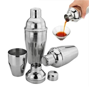 3.2" x 2.2" x 8.5" 18-ounce stainless steel cocktail shaker with lid.
