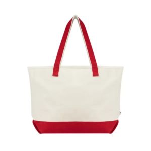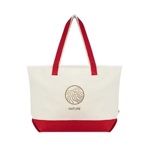 5" x 14.25" x 21.75" recycled cotton canvas tote bag with 28" handles and zippered main compartment.