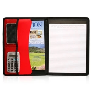 Block Portfolios with Colored PU Sewn Strap; Pen Loop on Colored Strap; 2 Mesh Pockets; Inside File Pocket; 20 Page Ruled Memo Pad