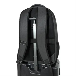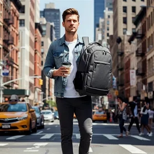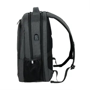 Durable polyester backpack with USB port and padded support, fits laptops up to 16"