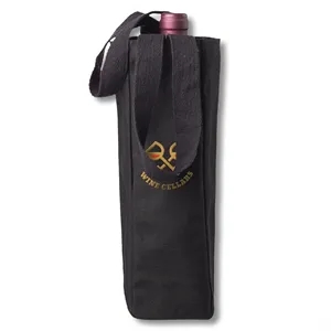 Single bottle canvas wine tote bag with webbed handles.