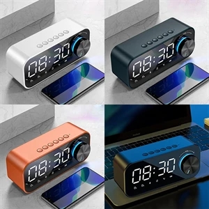6.3" x 2.76" x 2.76" wireless speaker and LED display clock with dual alarms, FM radio and three-level display dimmer.