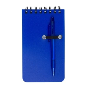 Flip open 50 page spiral bound jotter notepad with polypropylene cover and pen with loop holder.