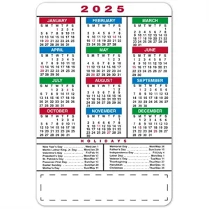 Multicolored 4" x 6" twelve-month magnetic calendar with holidays.