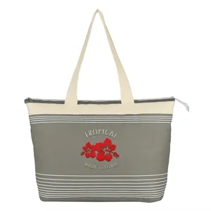Marina Tote. Made of 600 Denier Polyester. Top Zippered Closure. 24" Cotton Handles. Spot Clean/Air Dry.