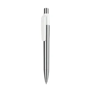 Click-action ballpoint pen with chrome finish metal barrel and blue ink.