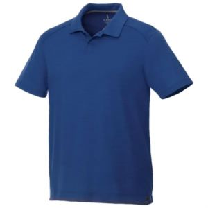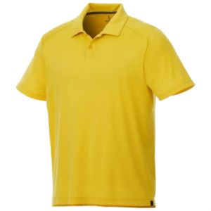 Men's short sleeve polo made of moisture wicking recycled polyester with UPF 40+ protection.