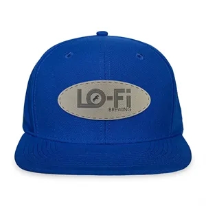 6 panel wool-woven polyester hat with flat brim, high-profile crown and plastic snapback closure.