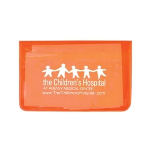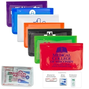 10 piece first aid kit with vinyl pouch, bandages, towelettes, hand sanitizer packets and a healthy guidelines insert.