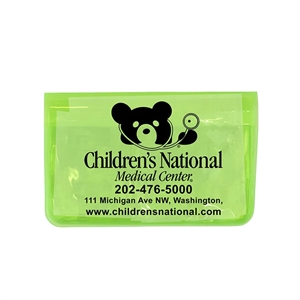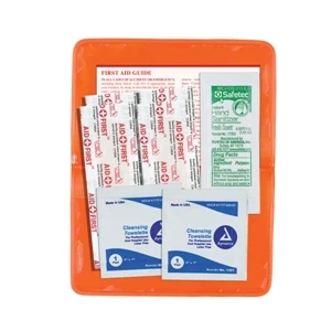 8 piece first aid kit with vinyl pouch, bandages, towelettes, hand sanitizer packet and a healthy guidelines insert.
