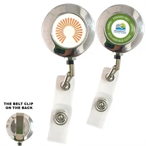Retractable 24" nylon cord. Optional full color decal or digital UV print; Belt clip on back; Metal Body; Vinyl snapback strap;