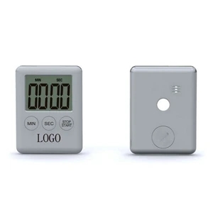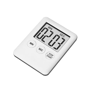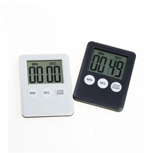 2.75" x 2" x 0.35" plastic kitchen timer with alarm, LCD display and magnet.