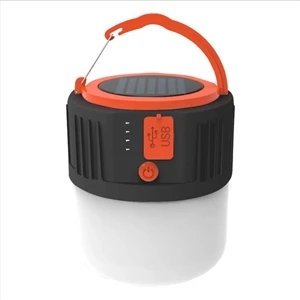 12cm x 9cm ABS plastic USB rechargeable camping light and emergency powerbank with hanging clip and five flash modes.