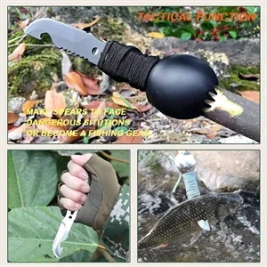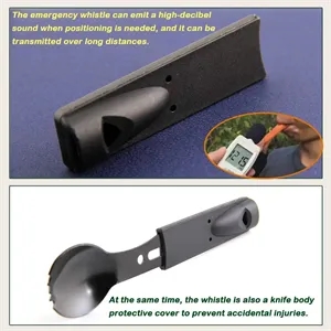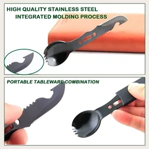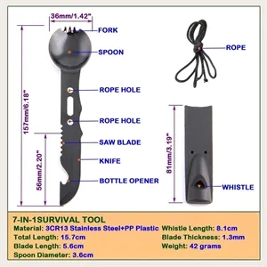 Custom Multifunctional Portable Camping Set Includes Spoon, Fork, Knife, Bottle Opener, Emergency Whistle, Serrated Blade, Rope.