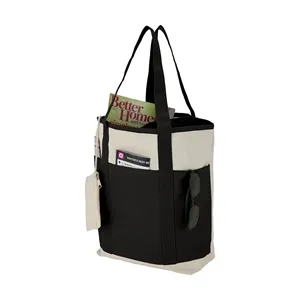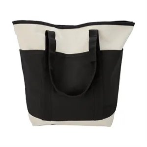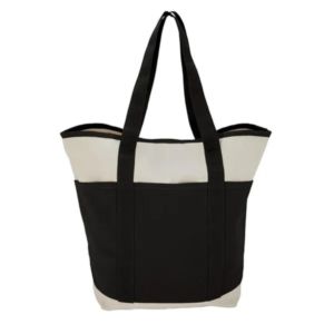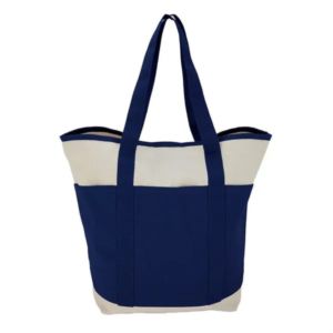 5.5" x 15" x 11" natural cotton canvas tote bag with 10 oz. capacity; has tethered pouch inside,1/2" gusset, and 22" handles.