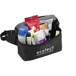 Recycled fanny pack with zippered main compartment and adjustable waist belt.