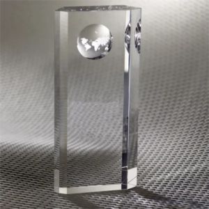 Optically perfect glass award with a free-standing obelisk, sharp side cuts and a concave globe etched on reverse side.