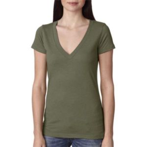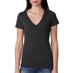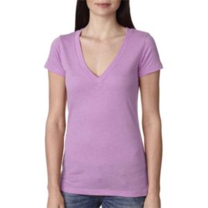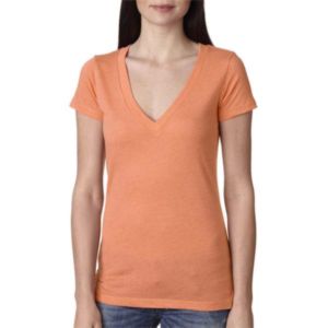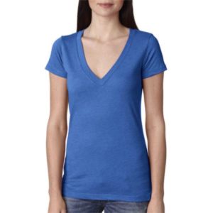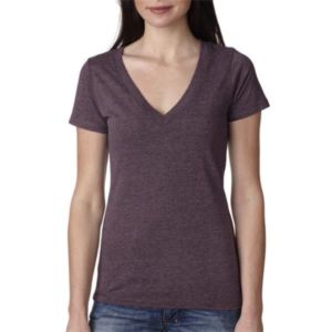 Ladies' triblend deep v-neck t-shirt made of 50% polyester, 25% combed ringspun cotton, 25% rayon jersey.