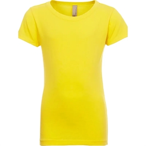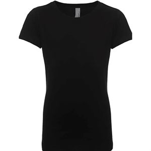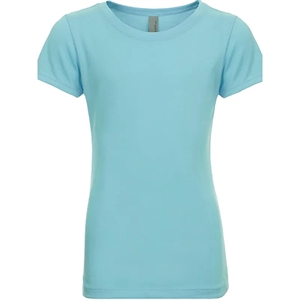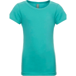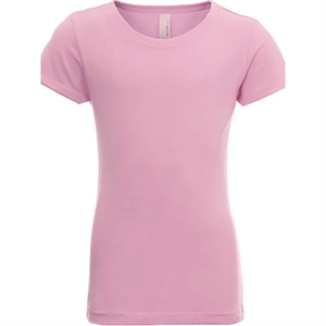 Girls' t-shirt with a 1x1 baby rib-knit set-in collar and cover-stitched front.