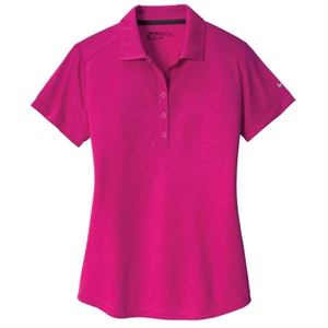 Ladies' polo with a collar, five-button placket, and open hem sleeves.