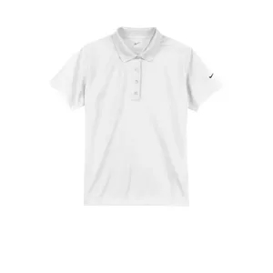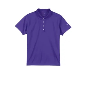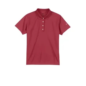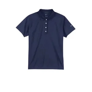 Ladies' polo with moisture management, collar, four-button placket, open hem sleeves, and buttons.