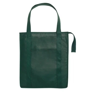 13" x 15" x 9" non-woven, insulated tote bag with 23" handles and top zipper closure.