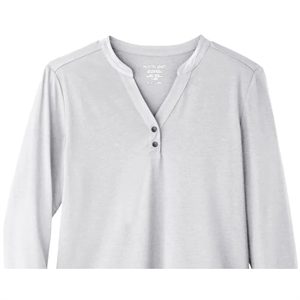 Ladies' stretchy pullover with moisture wicking and antimicrobial performance and a henley placket with metal two-snap closure.