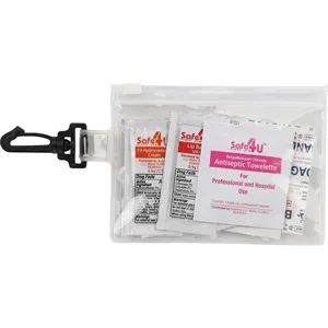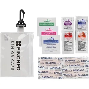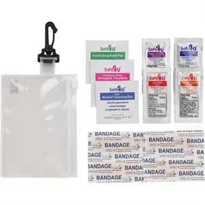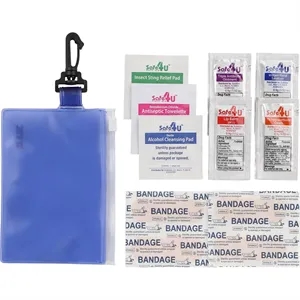 12 piece first aid kit in a zippered PVC pouch with carabiner.