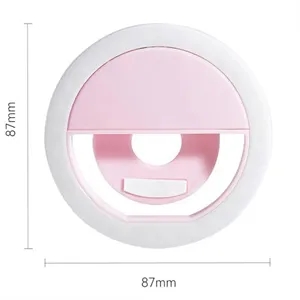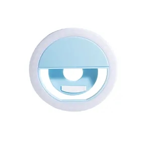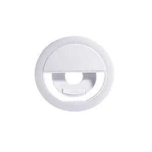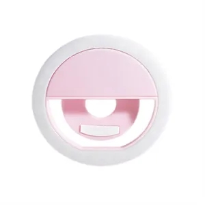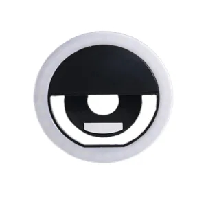 Clip-on selfie ring light with 3 brightness levels, LEDs, USB rechargeable. Compact and customizable with logo.