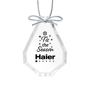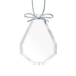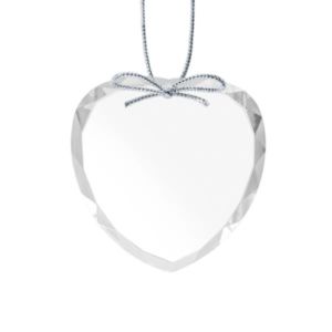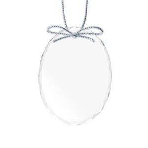 Optical crystal round ornament with silver ribbon.